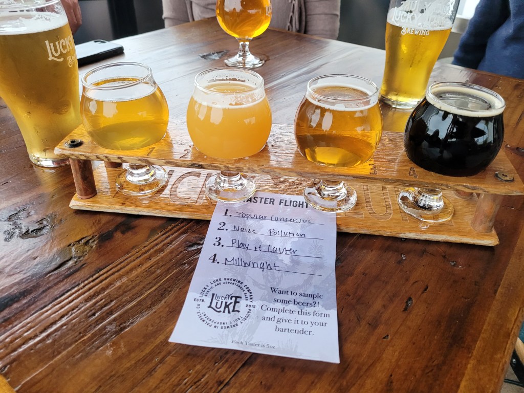 Each person ordered something different. Chauncey went for a flight with, from left to right in the photo, Popular Consensus (called a POG tart–not quite sour, featuring passion fruit, orange, and guava), Noise Pollution (a Hazy), Play It Lauter (a West Coast pale ale), and Millwright (an Oatmeal Stout). According to Chauncey, the stout had the others easily beat in flavor and overall satisfaction–though he “quite enjoyed” the Pog Tart.