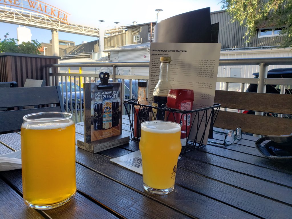 Chauncey and I staked out a table on the patio at the Taproom and ordered food and beers via an app. First, let me say that Firestone Brewery is a huge operation! Their blockbuster pilsner, 805, has put them on the map and clearly provided the funds for multiple buildings on multiple streets dedicated to the art of brewing beer.