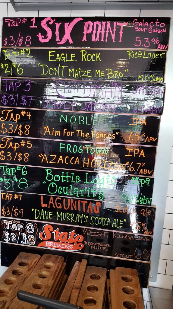 Noble and Bottle Logic were the most worthy of the eight (Eleanor and I met BRB at those breweries later that summer — but that’s a tale for a different post). I kinda liked Right Kinda Love from State Brewing in Gardena. But the Galacto Sour Saison from Brooklyn’s Sixpoint Brewery was enlightening, in my opinion — sauvignon blanc refreshment in beer form.