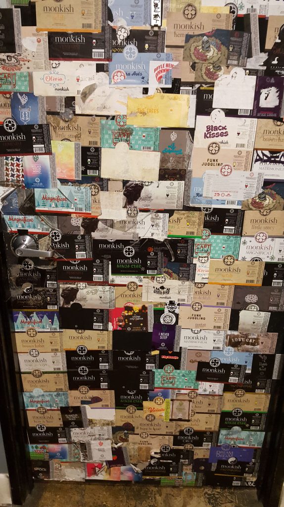 I did take a photo of a wall at Monkish that featured a collage of labels, which I’ll include below, just so you get a sense of what we missed. Like many, many breweries, the names of the ales are creative and entertaining.
