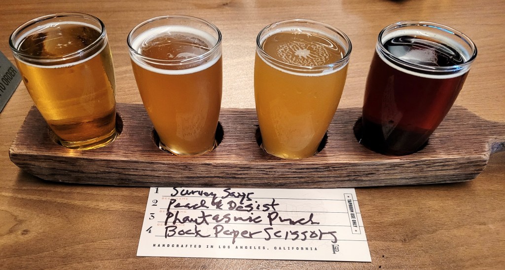 Maybe it was because I spent some of my formative years in Pacoima, then ethnically-mixed, now majority Latino. Maybe it was because, when I bellied up to order, I got into a great conversation with the on-duty manager (whose name I neglected to ask for). He and the beertender approved the flight Eleanor and I had picked, and so threw in a couple of their own selections, on the house — Mee-Moose-Sa, a barrel-aged sour made with tangerine, tangelo, and orange; and Wild Horse, a saison made with blueberries.